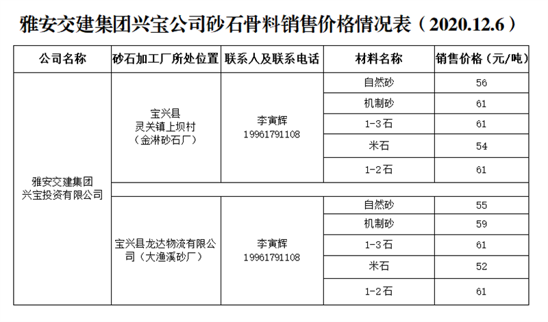 雅安交建集團興寶公司砂石骨料銷售價格情況表(2020.12.6)