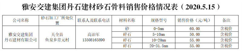 雅安交建集團(tuán)丹石建材砂石骨料銷售價(jià)格情況表(2020.5.15)