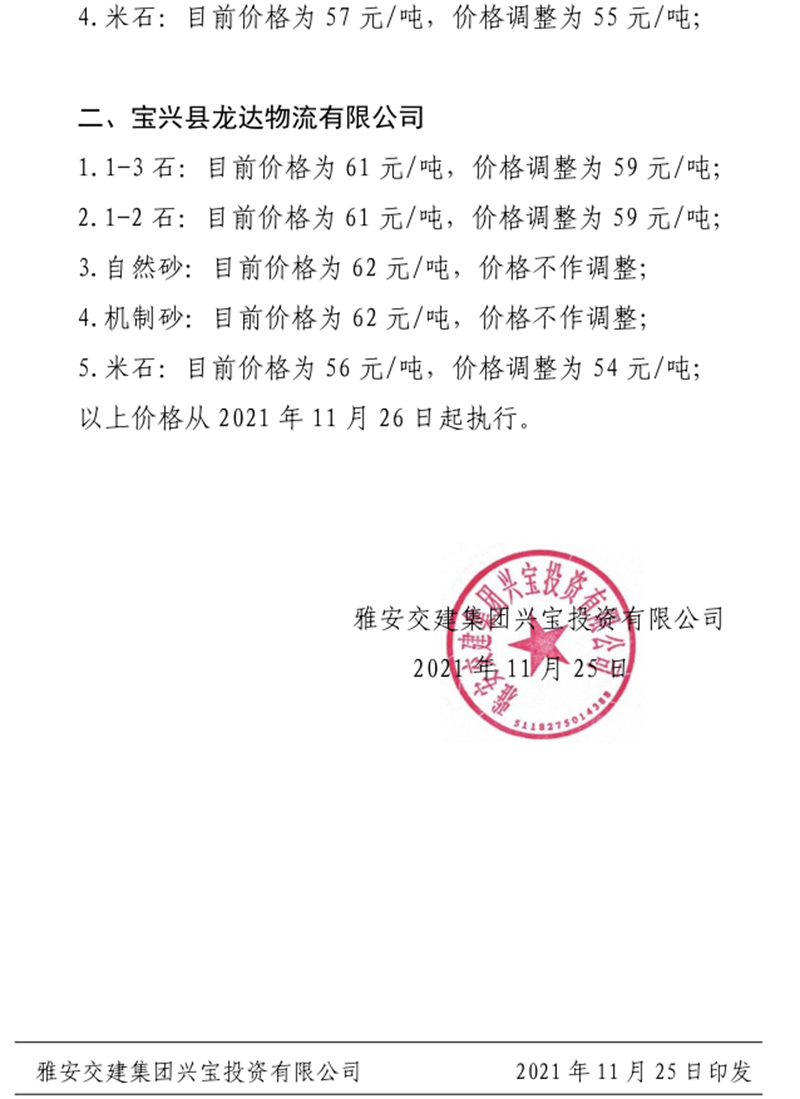 雅安交建集團(tuán)興寶公司關(guān)于調(diào)整成品料銷售價(jià)格的通知(2021.11.26)