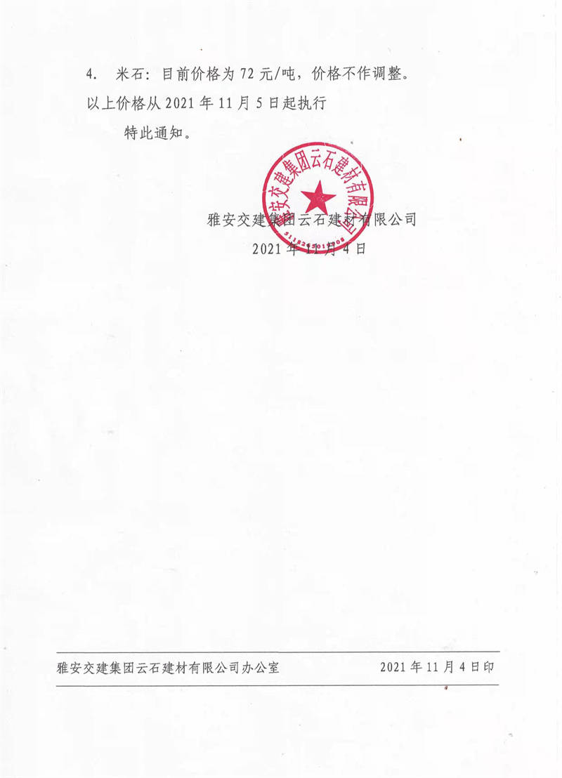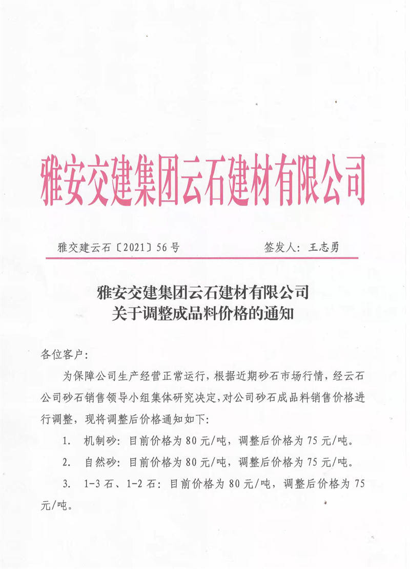 雅安交建集團(tuán)云石公司關(guān)于調(diào)整成品料銷售價格的通知(2021.11.4)