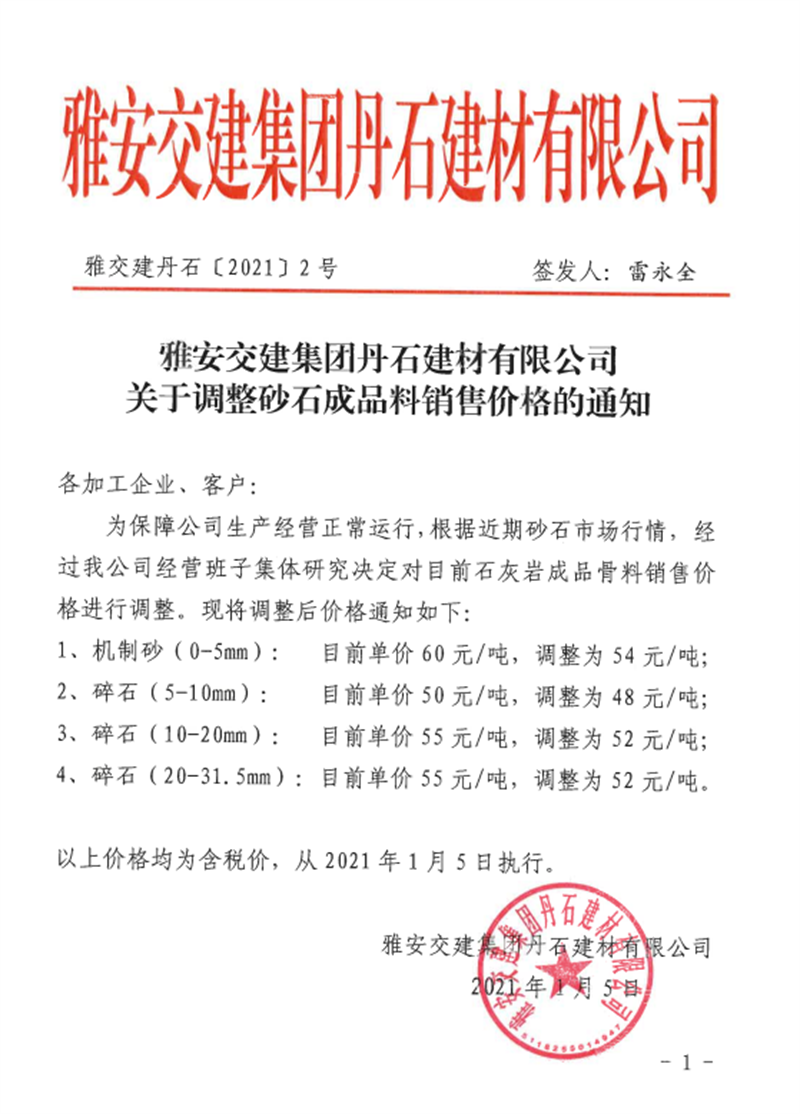 雅安交建集團(tuán)興寶公司砂石骨料銷售價(jià)格情況表(2021.1.14)