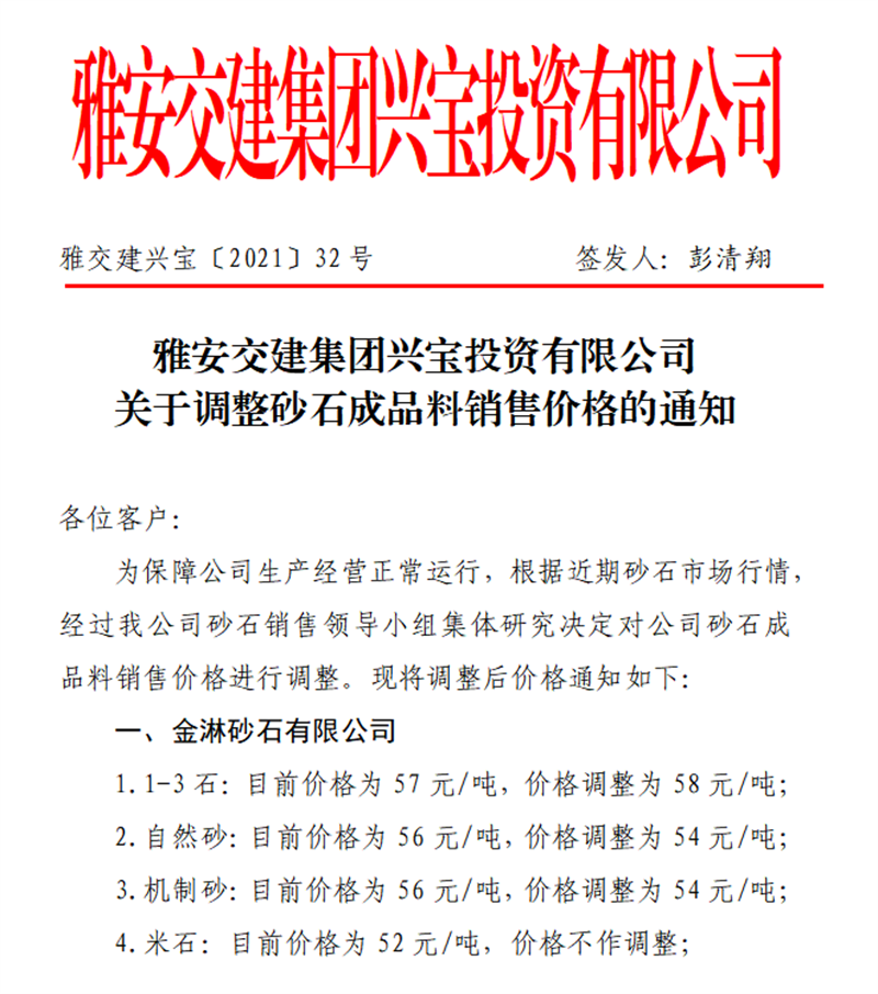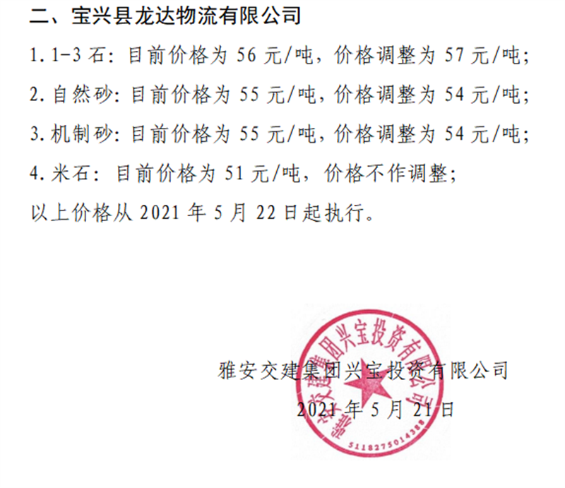 雅安交建集團興寶公司砂石骨料銷售價格情況表(2021.5.22)