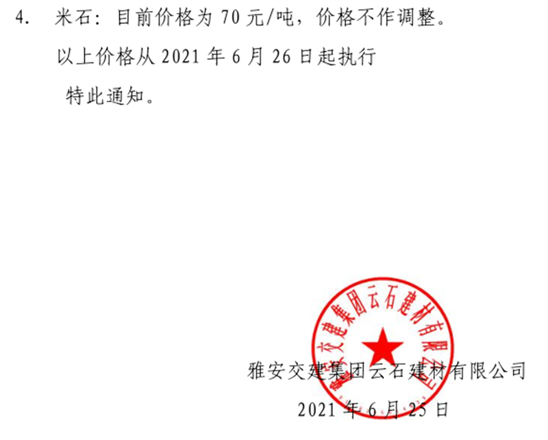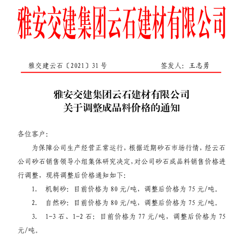 雅安交建集團(tuán)云石公司砂石骨料銷售價(jià)格情況表(2021.7.12)