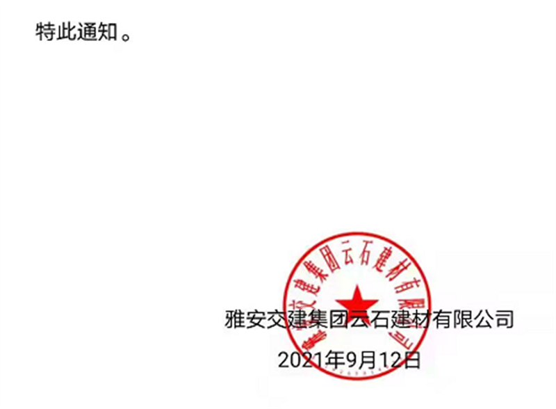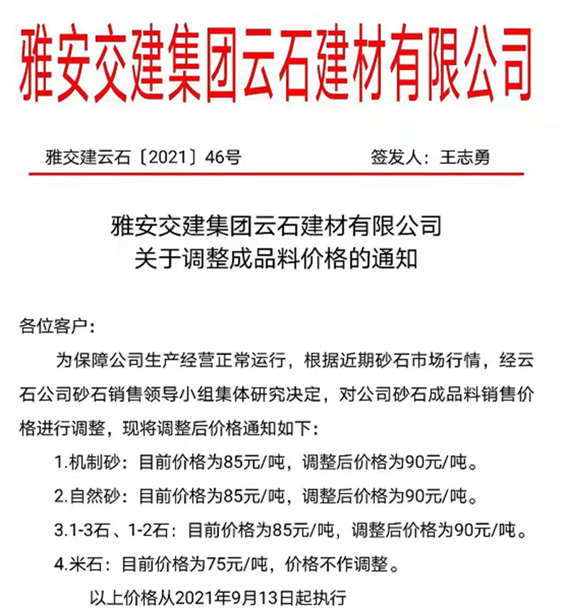 雅安交建集團云石公司關(guān)于調(diào)整成品料銷售價格的通知(2021.9.13)