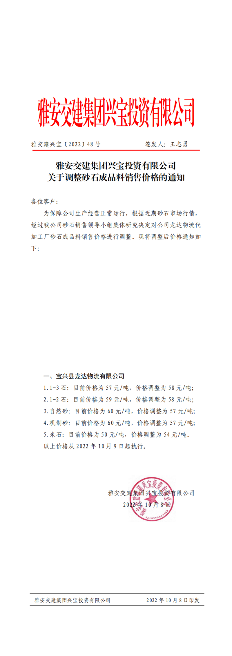 雅交建興寶〔2022〕48號(hào) 關(guān)于調(diào)整砂石成品料銷售價(jià)格的通知10.8