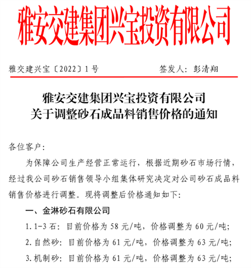 雅安交建集團(tuán)丹石公司關(guān)于調(diào)整砂石成品骨料銷售價(jià)格的通知(2022.1.5)