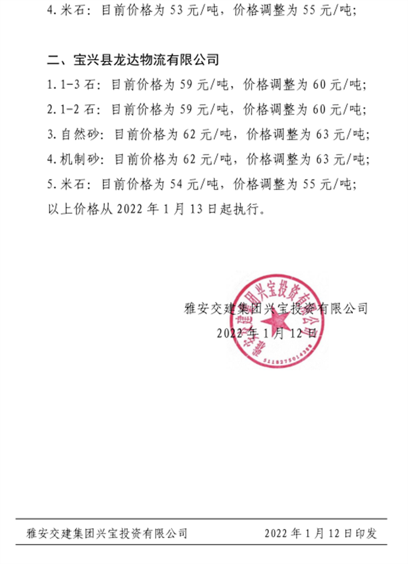 雅安交建集團(tuán)興寶公司關(guān)于調(diào)整成品料銷售價(jià)格的通知(2021.1.13)