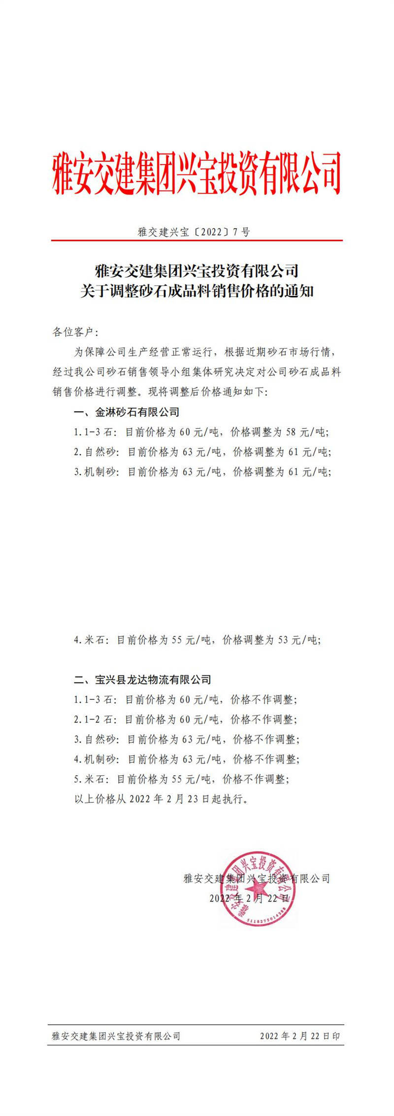 雅安交建集團興寶投資有限公司 關于調整砂石成品料銷售價格的通知(2022-2-23)
