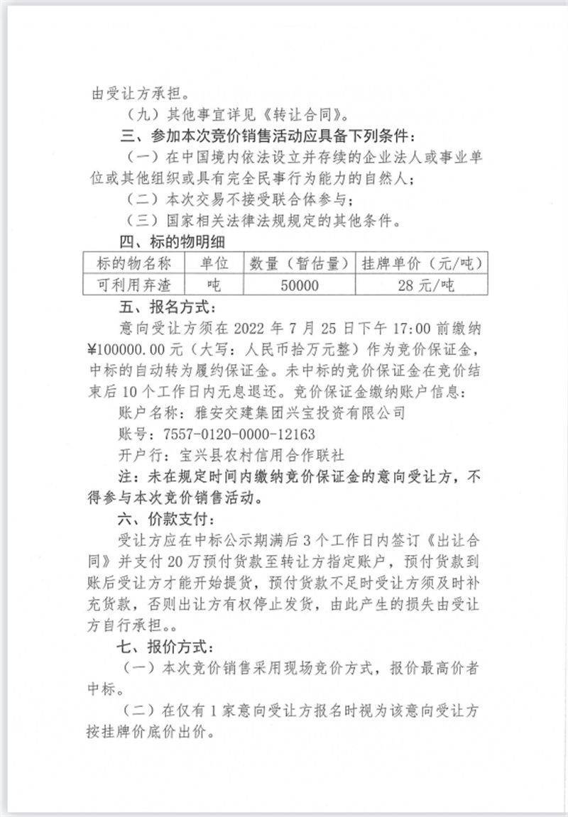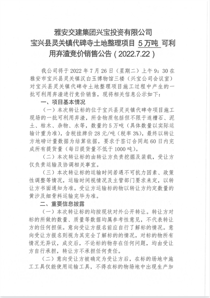 興寶公司寶興縣靈關(guān)鎮(zhèn)代碑寺土地整理項(xiàng)目10萬噸可利用棄渣競(jìng)價(jià)銷售掛網(wǎng)公告掛網(wǎng)公告7.22(5萬噸)