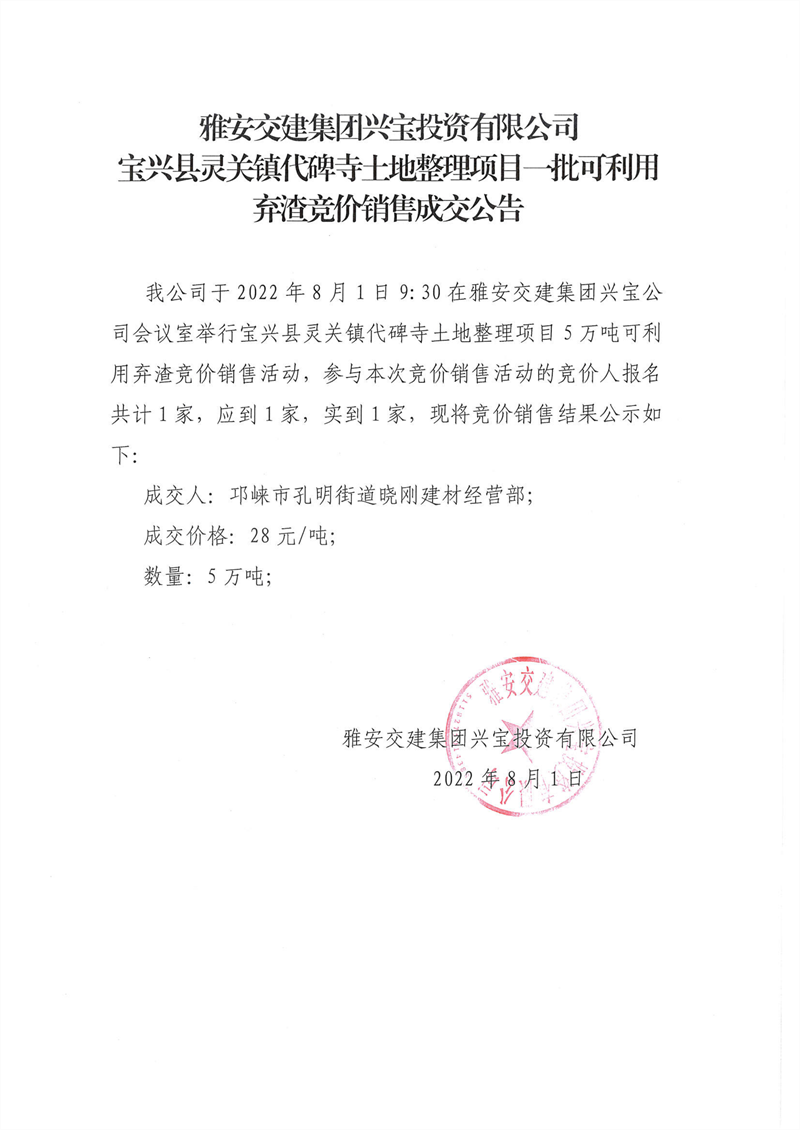 雅安交建集團(tuán)興寶投資有限公司靈關(guān)鎮(zhèn)代碑寺土地整理項(xiàng)目10萬(wàn)噸可利用棄渣競(jìng)價(jià)銷售成交公告(2022.8.1)