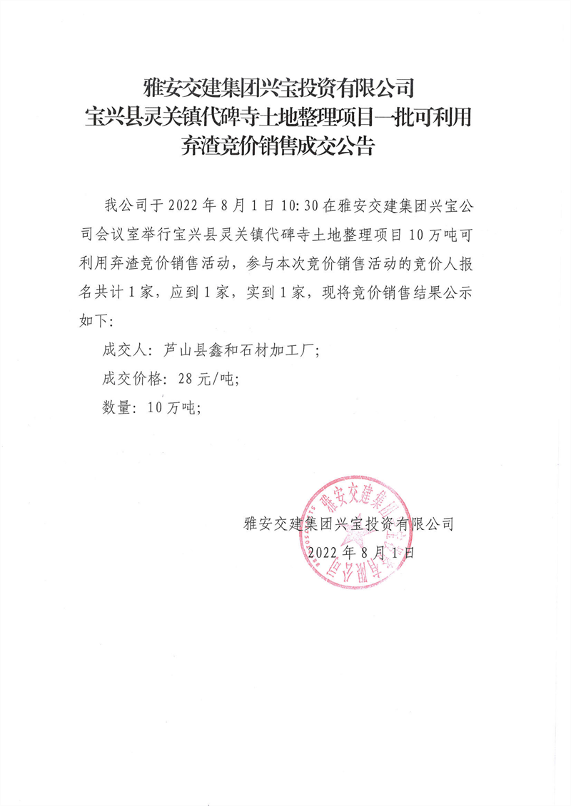 雅安交建集團(tuán)興寶投資有限公司靈關(guān)鎮(zhèn)代碑寺土地整理項目5萬噸可利用棄渣競價銷售成交公告(2022.8.1)