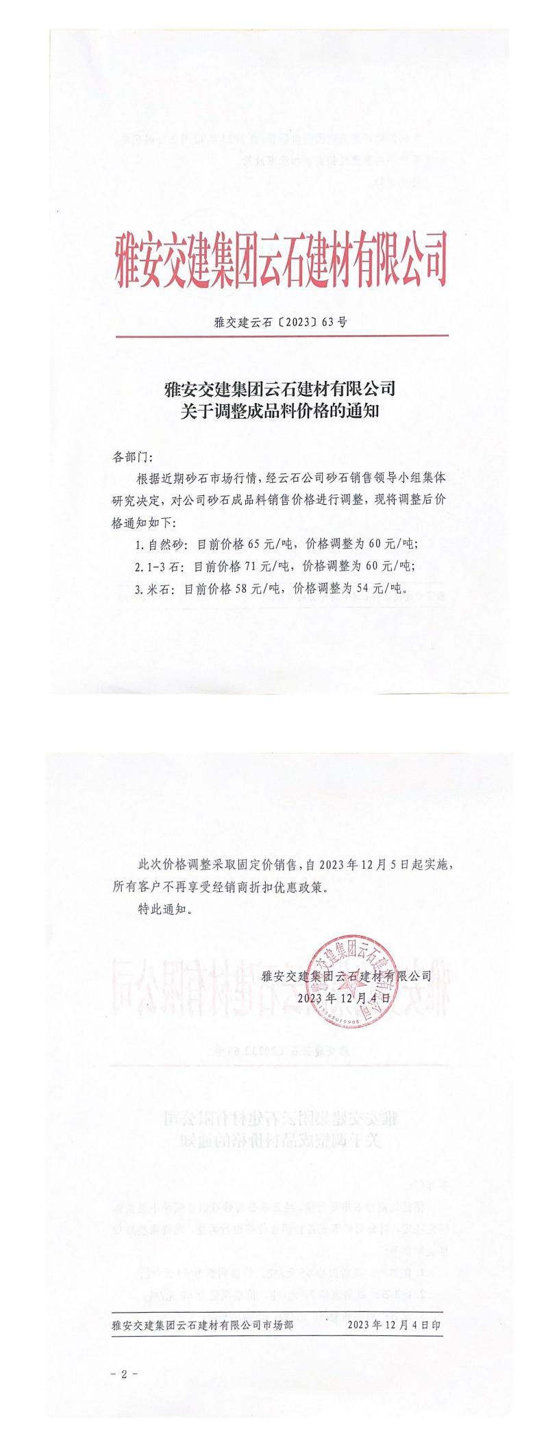 ÑŰ²½»½¨¼¯ˆFÔÆÊ¯½¨²ÄÓÐÏÞ¹«Ë¾³ÉÆ·ÁÏäNÊÛƒr¸ñÕ{(di¨¤o)Õû¹«¸æ£¨2023-12-04£©