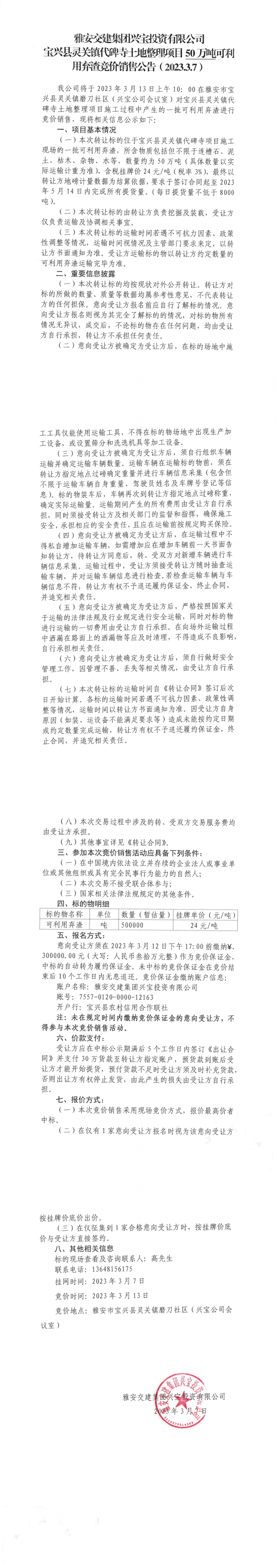 雅安交建集團(tuán)興寶投資有限公司靈關(guān)鎮(zhèn)代碑寺土地整理項(xiàng)目30萬(wàn)噸可利用棄渣競(jìng)價(jià)銷售公告(2023.3.8)