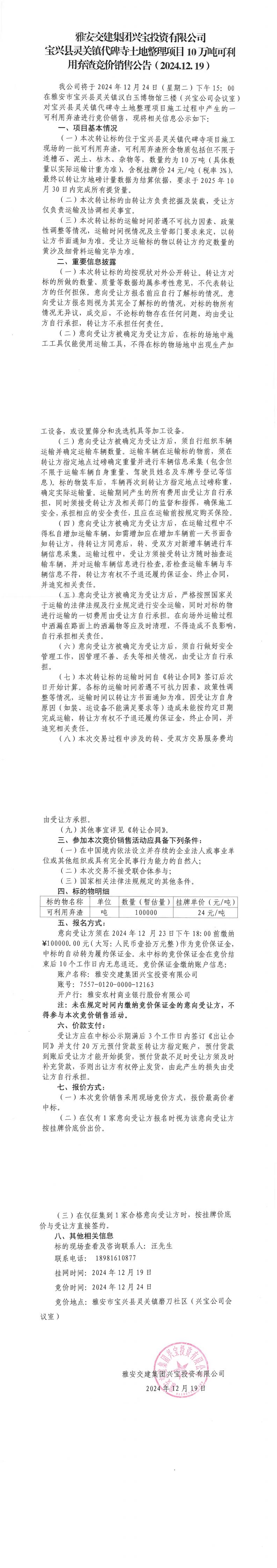 雅安交建集團(tuán)興寶投資有限公司靈關(guān)鎮(zhèn)代碑寺土地整理項(xiàng)目10萬(wàn)噸可利用棄渣競(jìng)價(jià)銷售公告(2024.12.19)