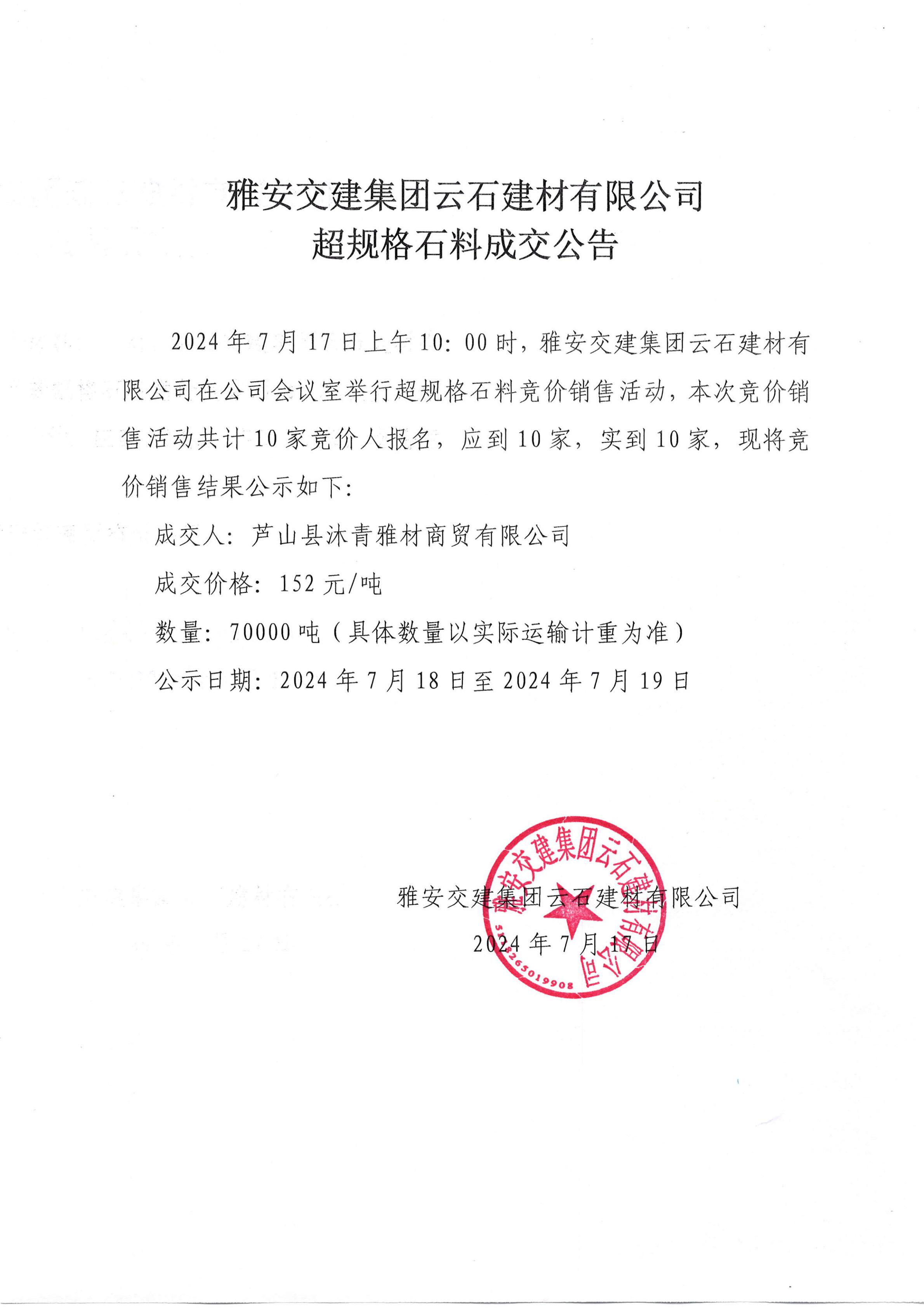 ÑŰ²½»½¨¼¯ˆF(tu¨¢n)ÔÆÊ¯½¨²ÄÓÐÏÞ¹«Ë¾ ³¬ÒŽ(gu¨©)¸ñʯÁϳɽ»¹«¸æ£¨2024.7.17£©